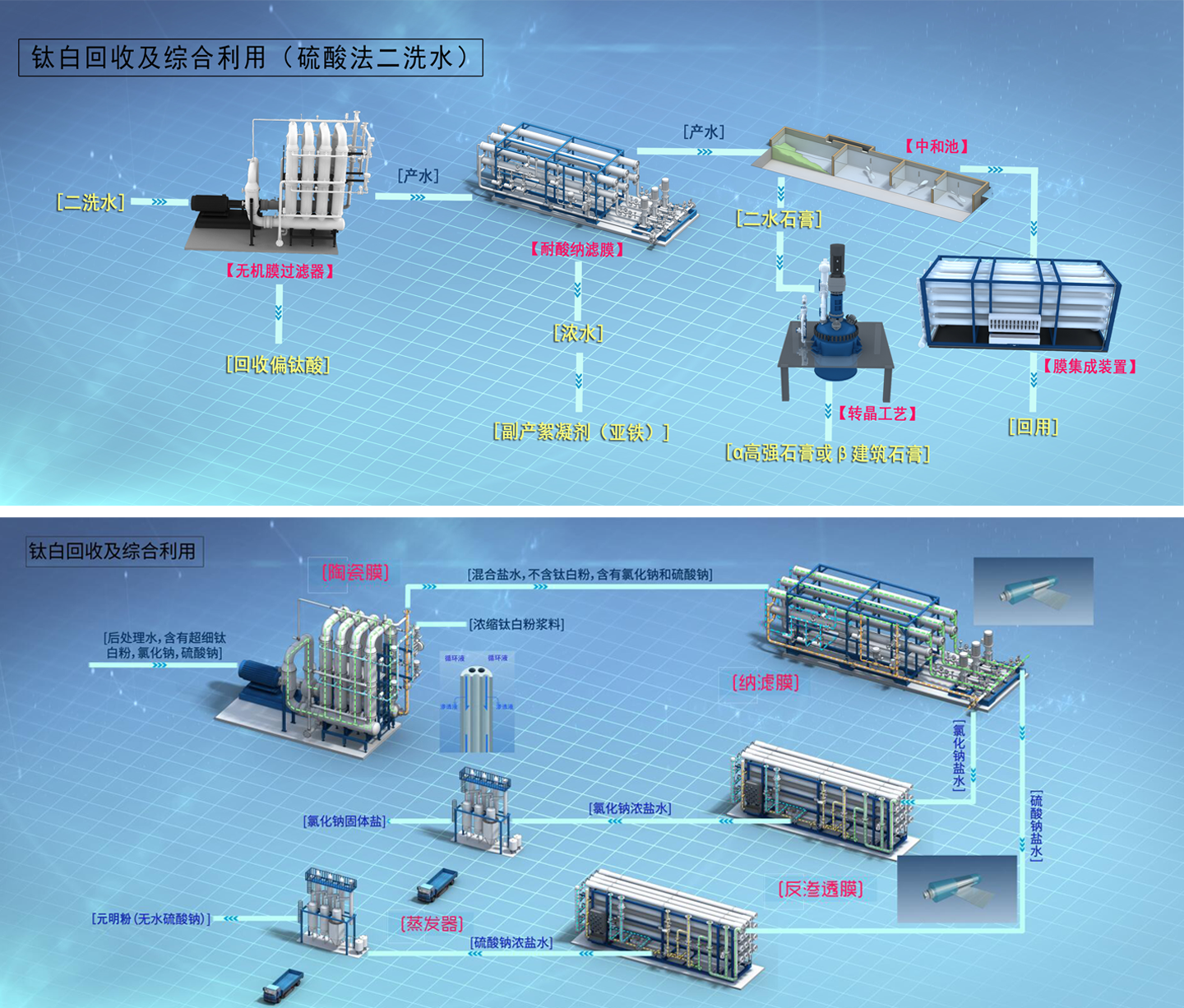 鈦白粉生產工藝分為硫酸法和氯化法,硫酸法生產過程廢水產生量巨大,氯化法廢水中含有三氯化鐵等難處理成分,處理成本高。傳統石灰中和等技術不能實現廢水中的水資源、硫酸、二氧化鈦、偏鈦酸等有價值物質回收,嚴重制約行業的發展。 主體工藝:硫酸法后處理水零排放處理工藝,氯化法后處理水零排放處理工藝,氯化法渣水處理工藝。