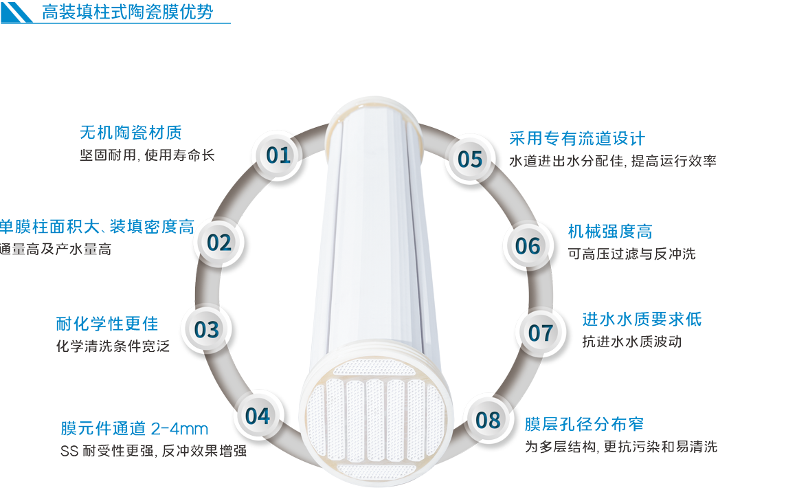 抖圈人生就是搏高裝填柱式陶瓷膜是在抖圈人生就是搏傳統(tǒng)管式陶瓷膜及平板式陶瓷膜技術基礎上研制出的一款用于水處理的無機超濾膜。高裝填柱式陶瓷膜是采用高強度α-Al2O3在高溫下焙燒制成,擁有良好的耐高溫性能,抗化學腐蝕性,優(yōu)秀的機械強度。相對傳統(tǒng)多通道管式陶瓷膜,高裝填柱式陶瓷膜單支膜管過濾面積可達 10-25 ㎡,擁有更大的裝填密度及處理能力,能夠有效去除固體懸浮物、細菌以及膠體等物質(zhì),可應用于民用安全用水、市政給水和廢水處理、應急供水、水回用、工業(yè)過程廢水等多個領域。
